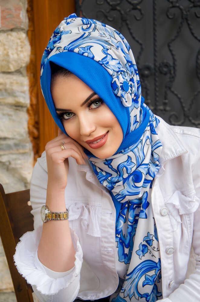 Beyaz Mavi Retro Desen Çiçekli Pratik Şal