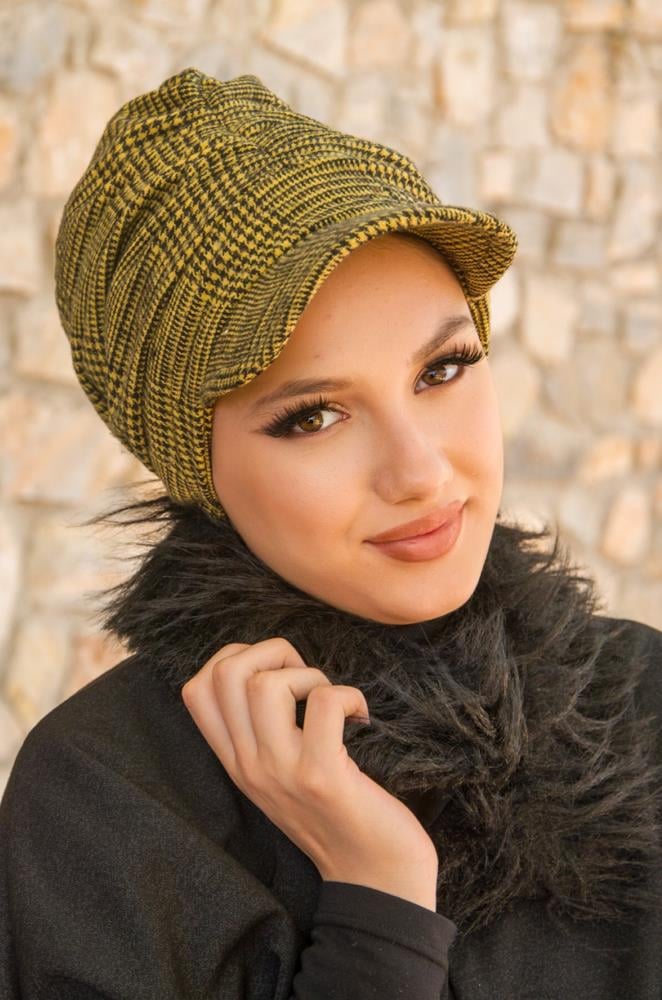 Hardal Siyah Ekose Desen Tesettür Şapka