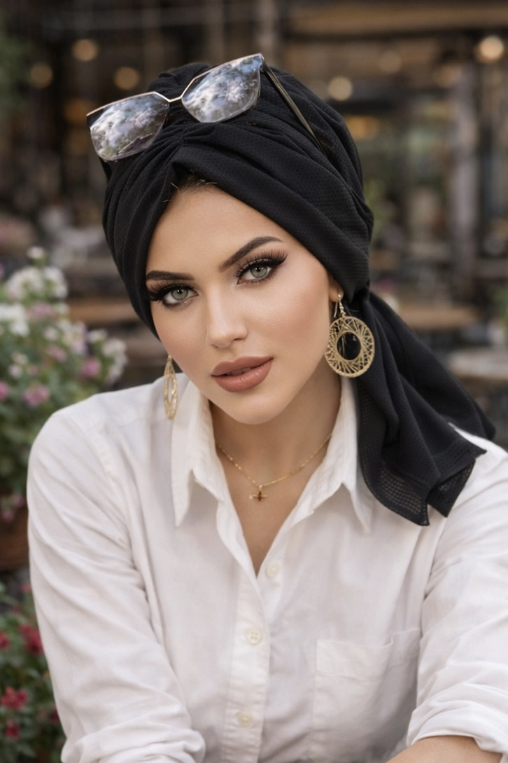 Yepyeni bir pratik tasarım daha siz hanımların beğenisine sunuldu. Yaz kış kullanabileceğiniz şık rahat ve pratik günlük ve abiye kullanıma uygun siyah pratik bone. Her kıyafete uygun rengi ve kullanışlı kumaşı ile her mevsim kullanabilirsiniz. Ütü istemeyen saniyeler için saç toplar gibi takabileceğiniz bu model yeni tasarımlarımız arasında yenini aldı. Büzgülü kısmını yüzünüze ortalayarak takın. Kalan uçları kendi kumaşından olan tokası ile saç toplar gibi enseden bağlayın. İsterde topuz yapın ister kalan parçayı bonenin içine sıkıştırın.